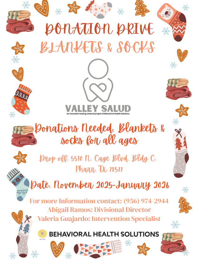 As the temperatures start to drop, let’s help keep our community warm! Our IHCP (Valley Salud) Program is collecting new socks and new blankets for those in need this winter. Drop-off Location: 5510 N Cage Blvd. Building C, Pharr TX Now through: January 2026 Every donation makes a difference — something as simple as a […]
